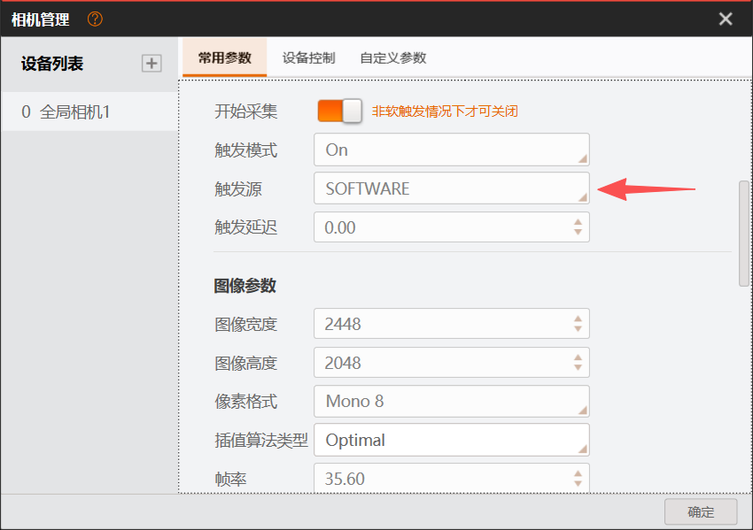 图像采集触发源选择 SOFTWARE,否则影响软件下发指令采集图像。