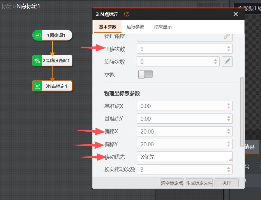 N 点标定中选择 9 点标定,填写偏移值和选择首次移动方向。