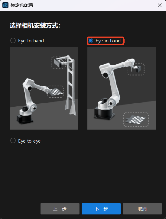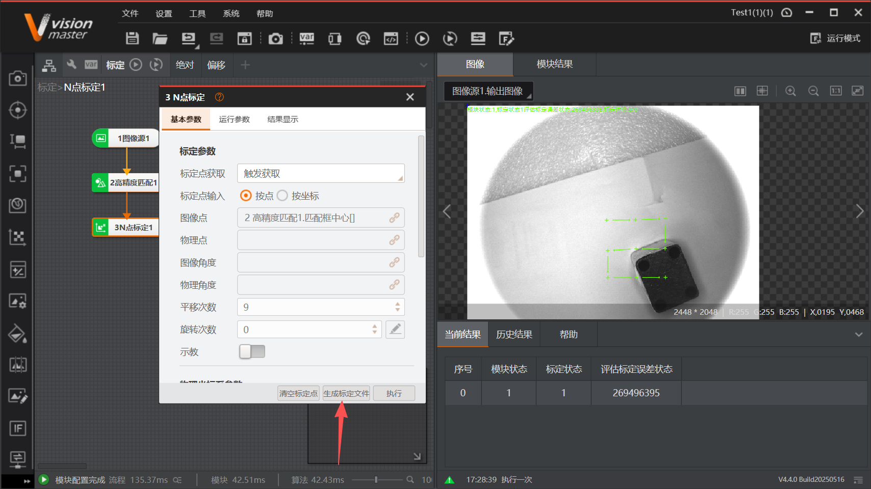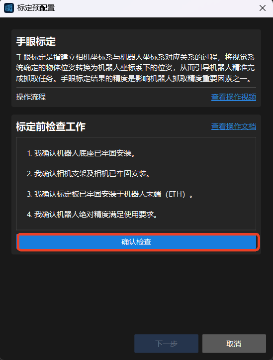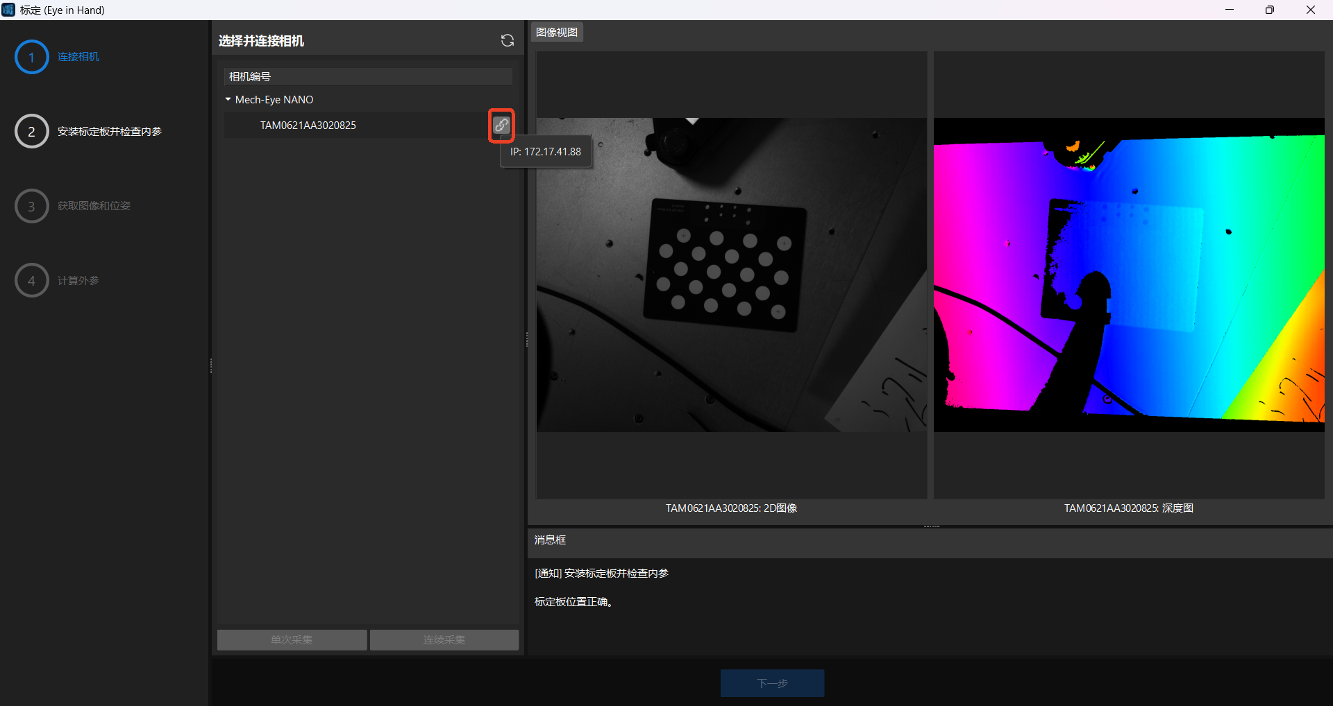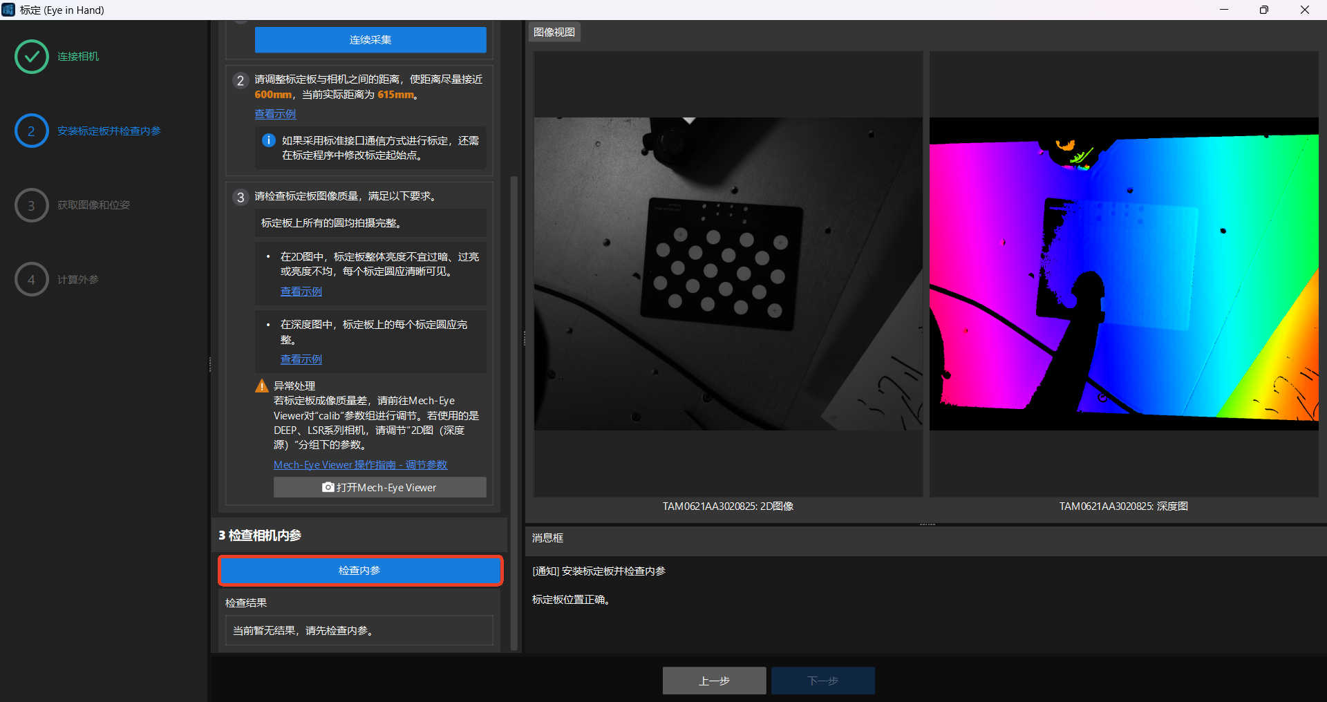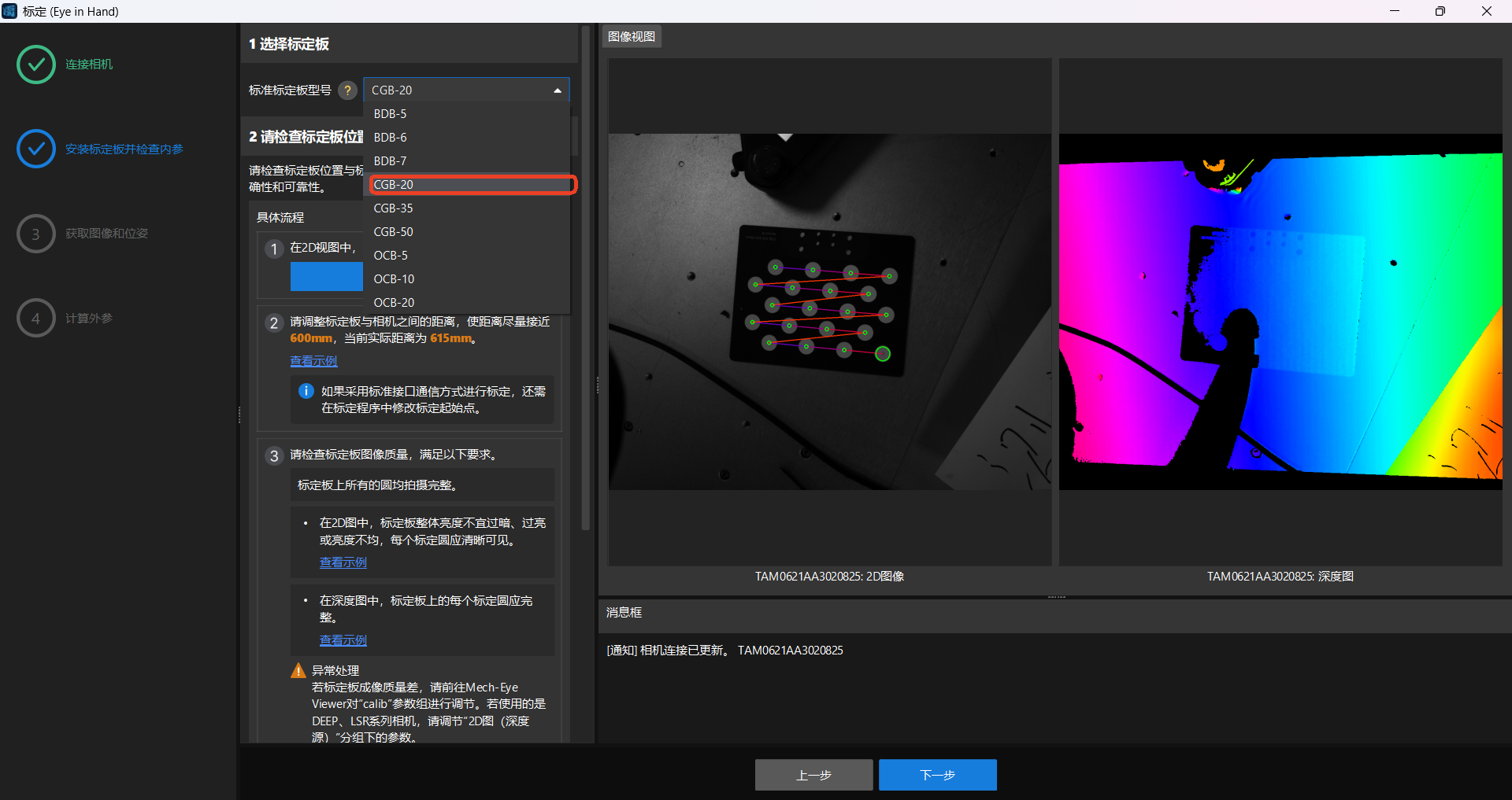 选择使用的标定板型号,并按软件引导检查标定板位置、图像。