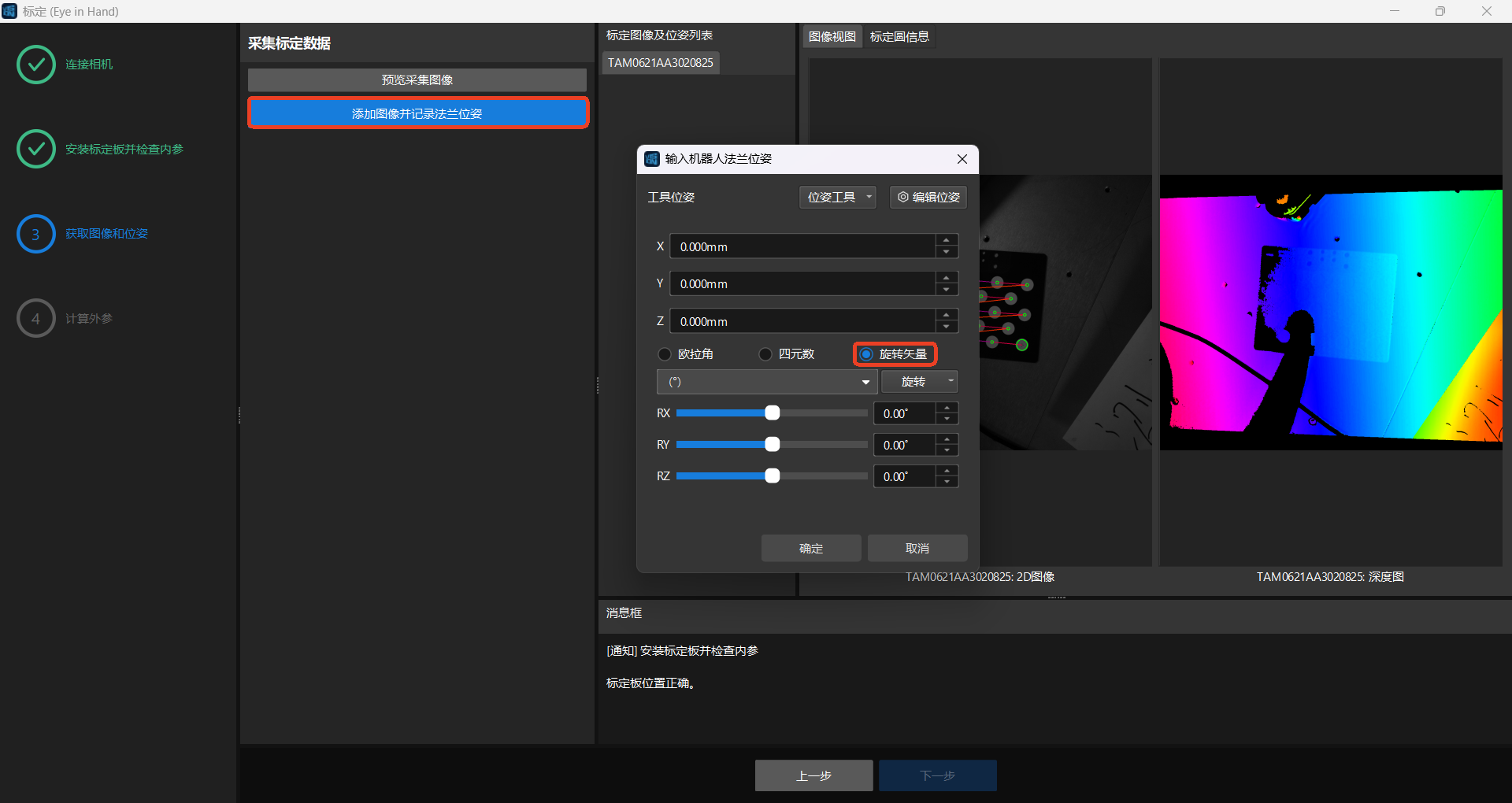 添加图像并记录法兰位姿(至少 20 个点位),记录点位时勾选旋转矢量。