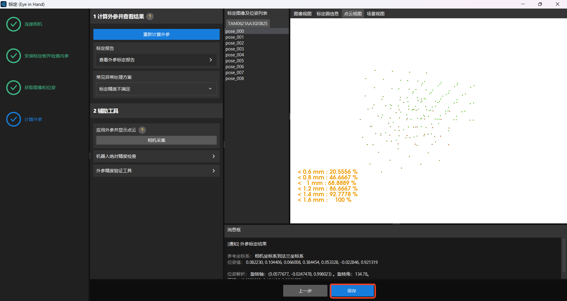 记录足够路点后计算外参并保存标定结果,结束标定。