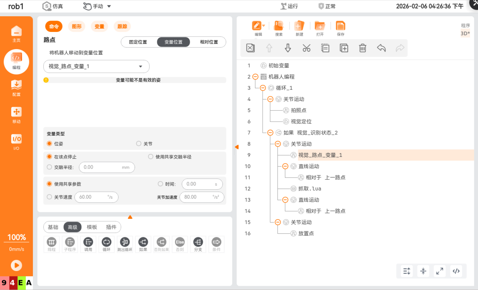 移动机械臂使相机可以拍摄到被抓取范围,设置该点位为拍照点,视觉定位节点选择路点变量,并输入对应抓取物的代码。