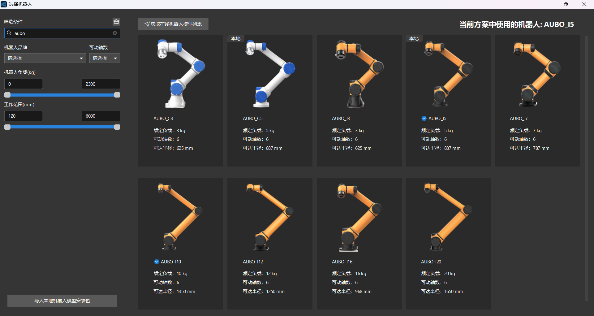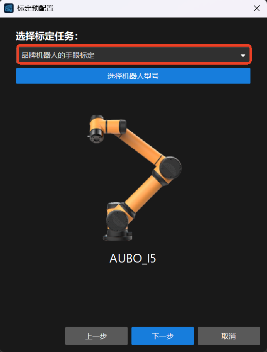 选择品牌机器人的手眼标定,搜索 AUBO 并选择目标机器人型号。