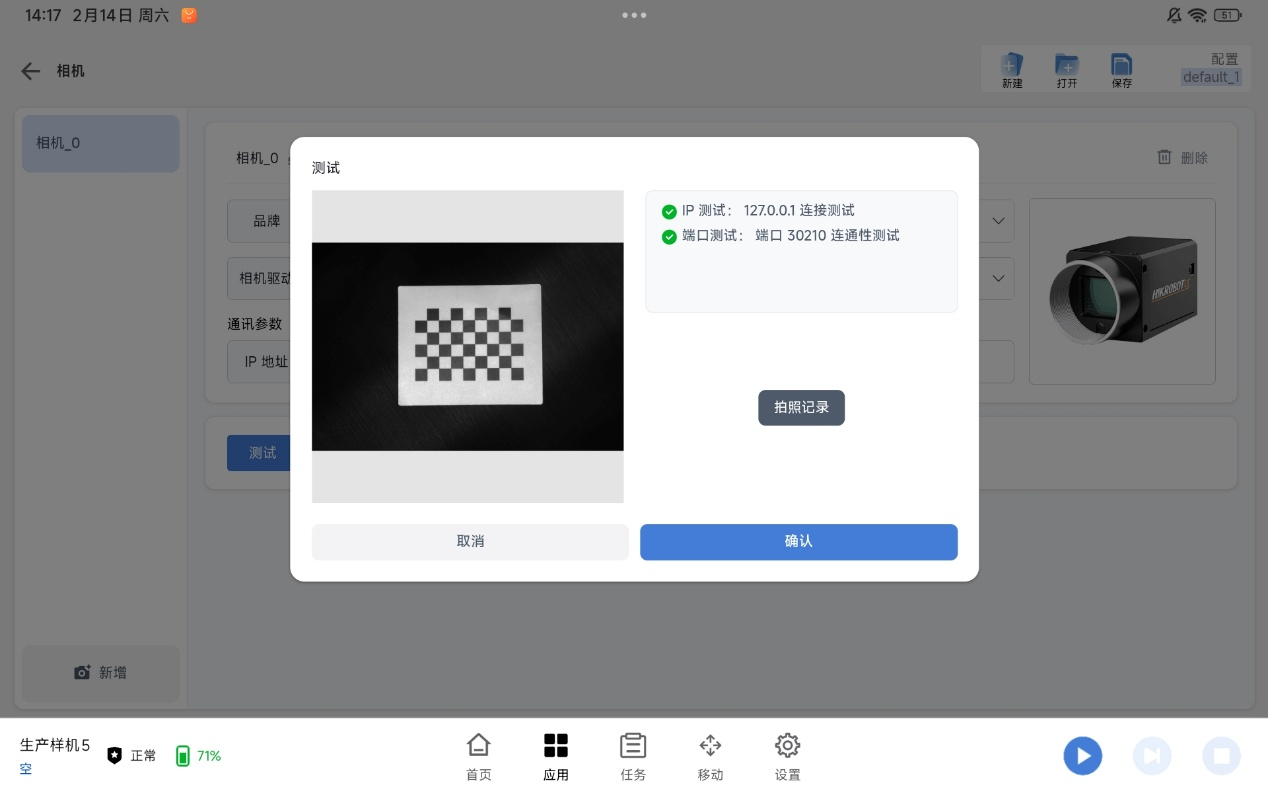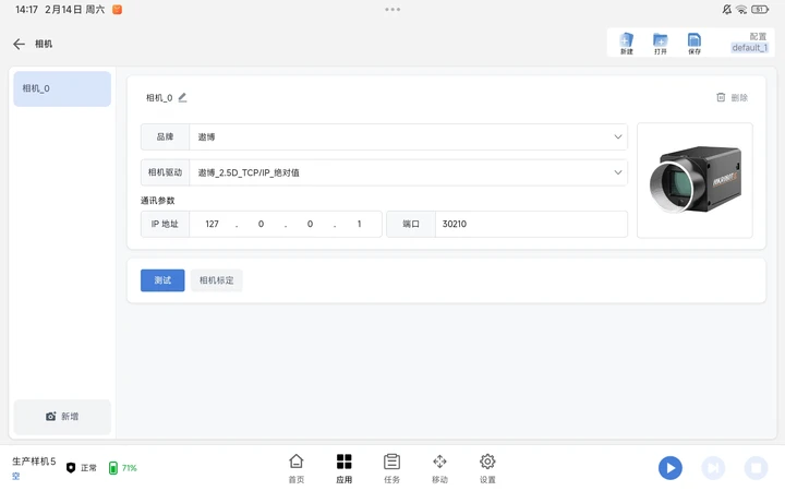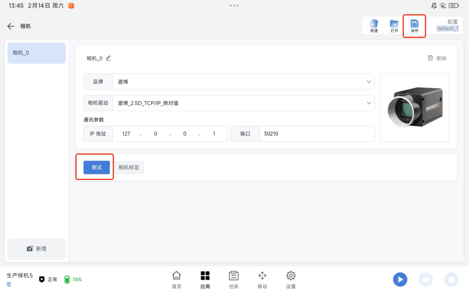 按照下图输入相机参数,完成后单击右上角【保存】单击【测试】,查看相机能否正常拍摄。