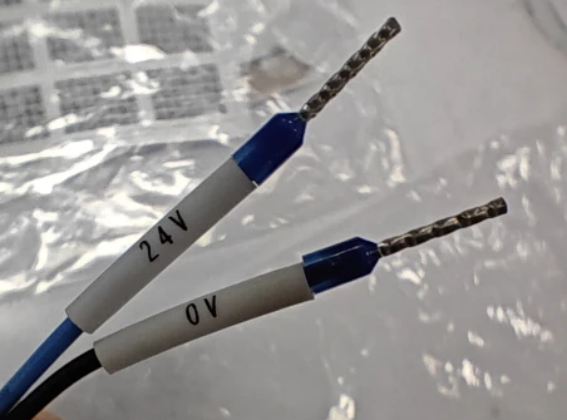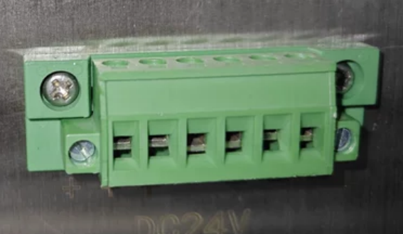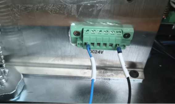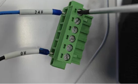 接线端子左侧三孔为 24V,右侧三孔为 0V。将蓝色 24V 和黑色 0V 接入端子并用一字螺丝刀紧固。