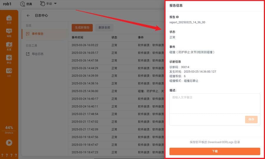 事件报告的生成有两种途径,当系统监控到某些异常后会自动生成事件报告,比如碰撞、触发保护性停止、软件崩溃等。这时候只需要等待事件报告生成结束,下载使用即可。也可以手动生成事件报告。