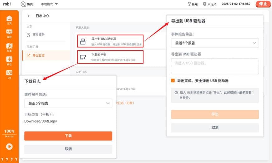客户端(APP)的日志中心旁边有 “导出日志” 按钮,而有线示教器中没有此按钮。