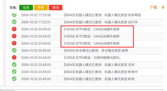 在机械臂的运行过程中,突然弹窗can总线错误,因为硬件排查需要一定的硬件知识以及一些额外工具,这里尝试从软件以及日志层面给大家讲一下排查步骤。