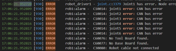 这里可以看到6个关节全部报错,且工具板、基座板、机器人全部通信断开。 这种也是典型的硬件问题。