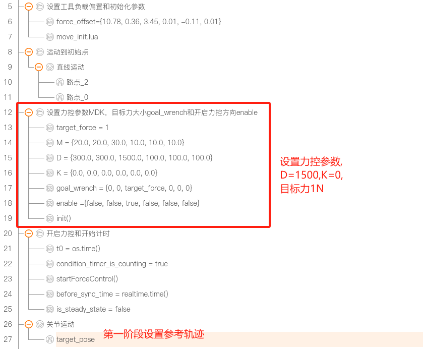 - M = {30.0, 30.0, 30.0, 10.0, 10.0, 10.0} - D = {1000.0, 1000.0, 100.0, 100.0, 100.0, 100.0} - K = {1000, 1000.0, 500, 100.0, 100.0, 100.0} - goal_force = -5情况描述:
