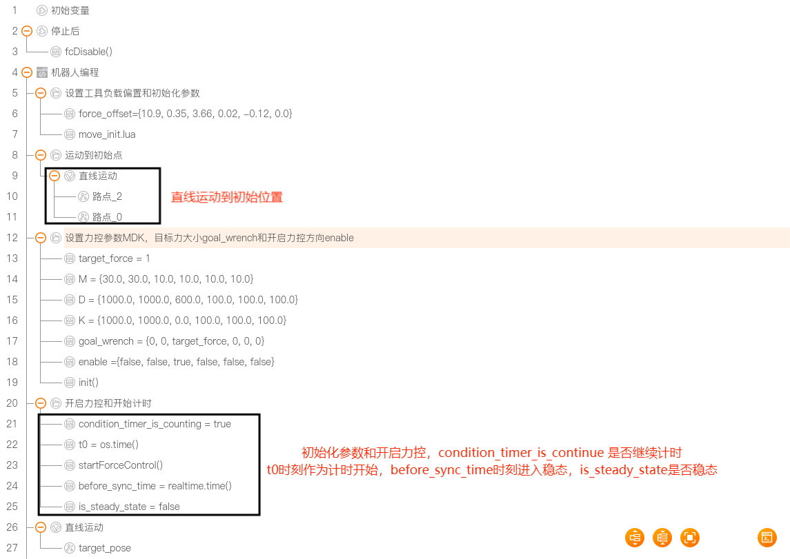 - 第二段,以力平衡点为基准点,在基准点 Z 不变的情况下,设置另外两个参考点,这三个点构成一条圆的轨迹。将设置好的圆的参考轨迹给力控,根据力控反馈的力的值修正圆的轨迹,时刻保持在 1N 左右直到圆形绘制完成。结束条件包括 运动超时、运动到位、力控超出最大力达到保护性停止。