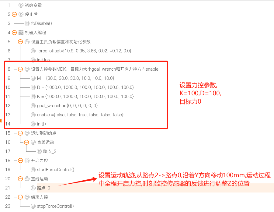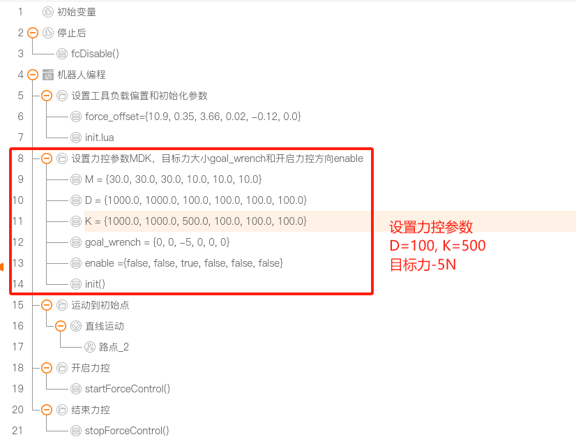 实例说明 : 在实例1演示的拖动中增加目标力 -5N,机械臂会受目标力影响,一直朝着能使目标力平衡的方向移动,直到受到相等的外力使机械臂达到平衡状态,机械臂停止运动。该实例中,目标力为 -5N,机械臂向下运动,直到给工具向上 5N 的外力使之达到平衡状态。