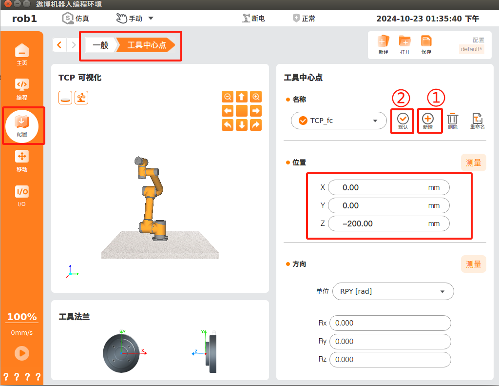 使用力控插件的相应功能前需要先在“配置>一般>工具中心点”处添加 TCP。单击【添加】,然后输入工具中心点相对于法兰中心的偏移值,并将此 TCP 设置为【默认】,如图所示。