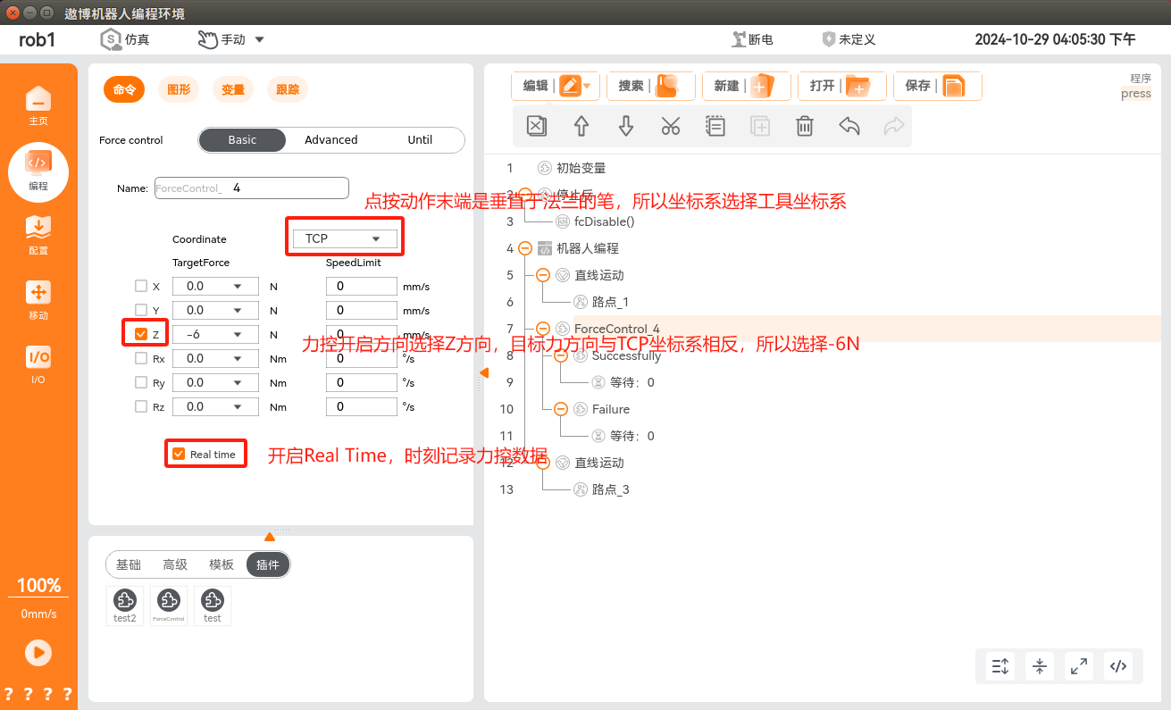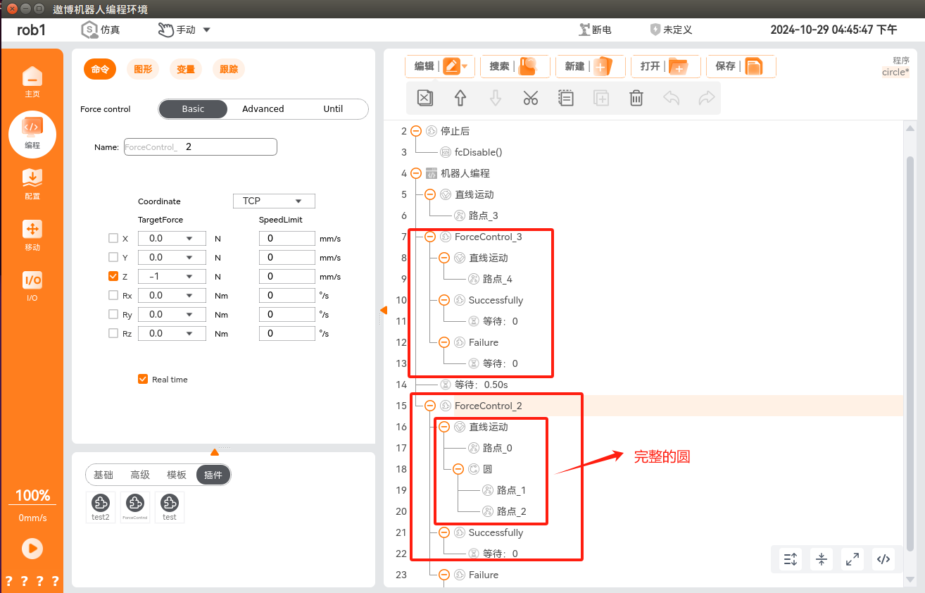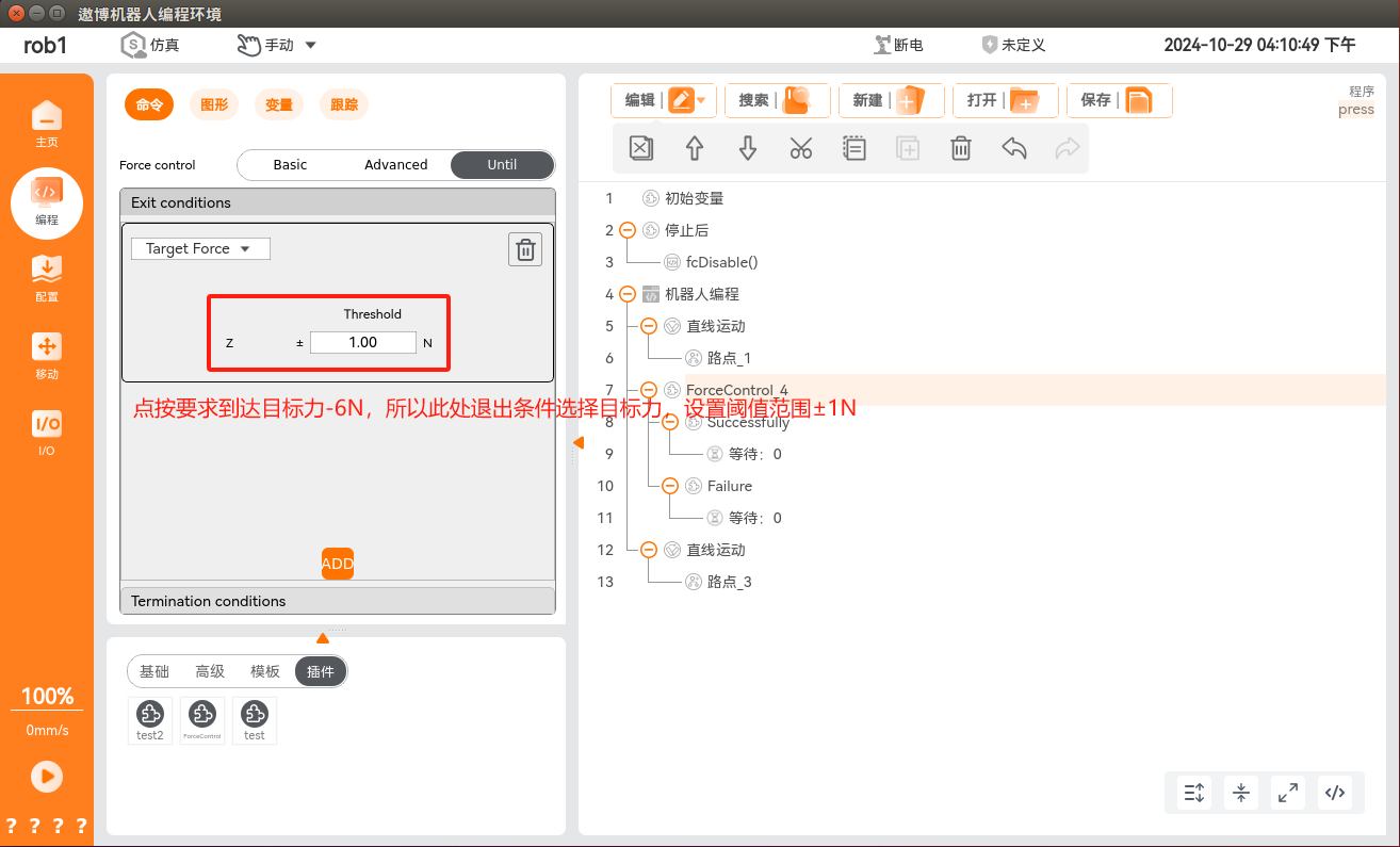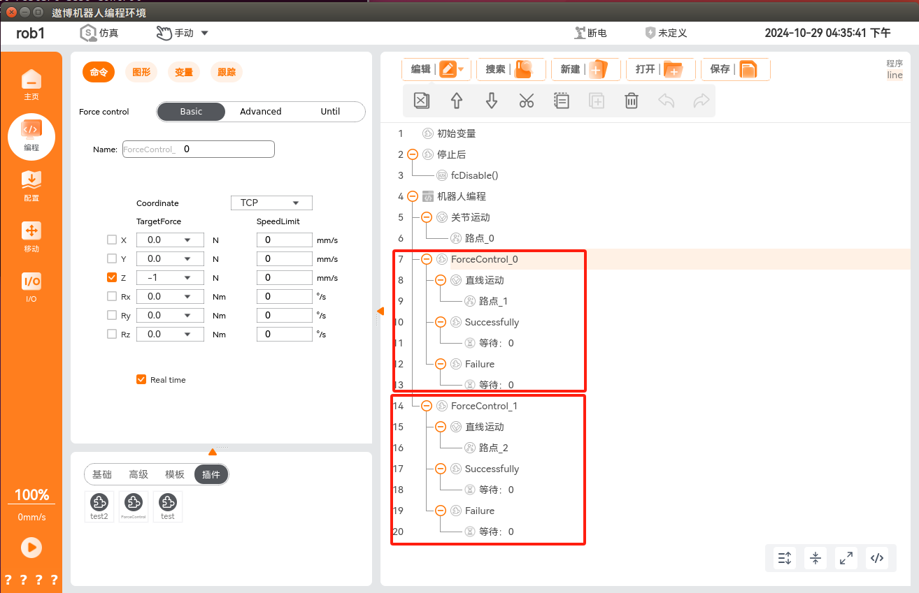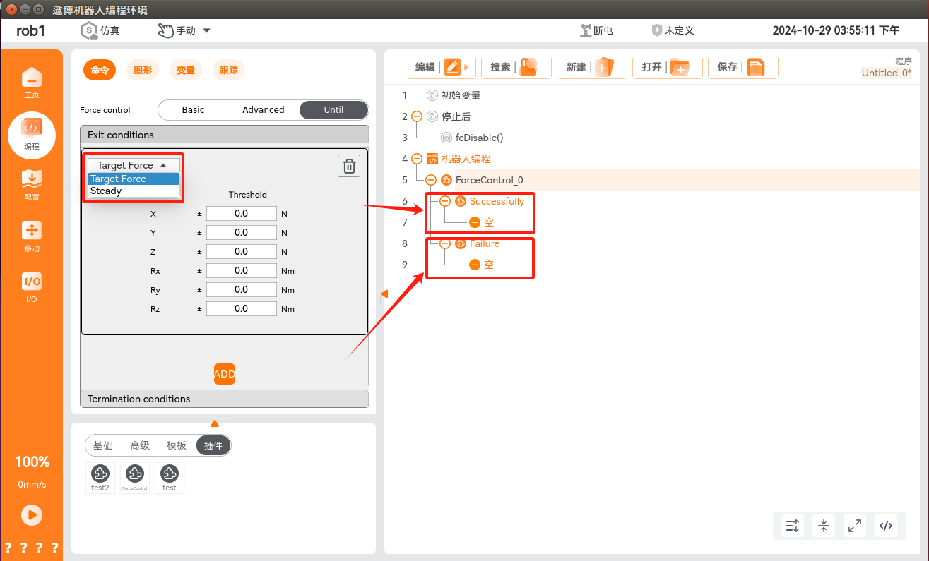 在程序节点中添加力控条件,单击“编程 > 插件 > ForceControl”,即可添加力控条件,此条件分为力控条件配置和正常/异常退出力控条件后的流程实现。