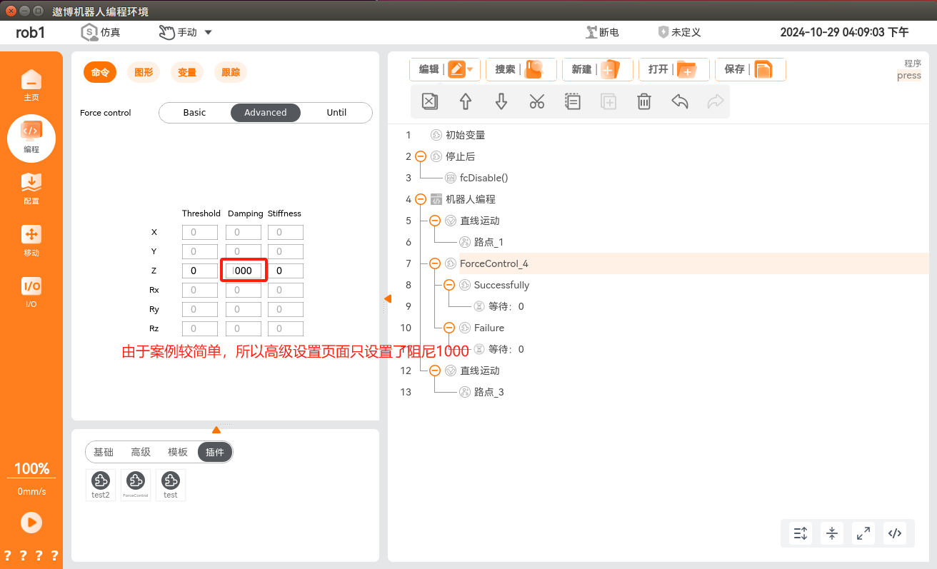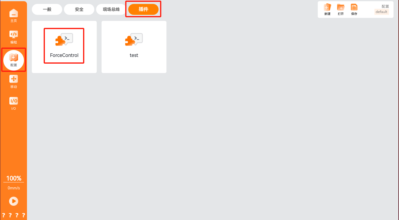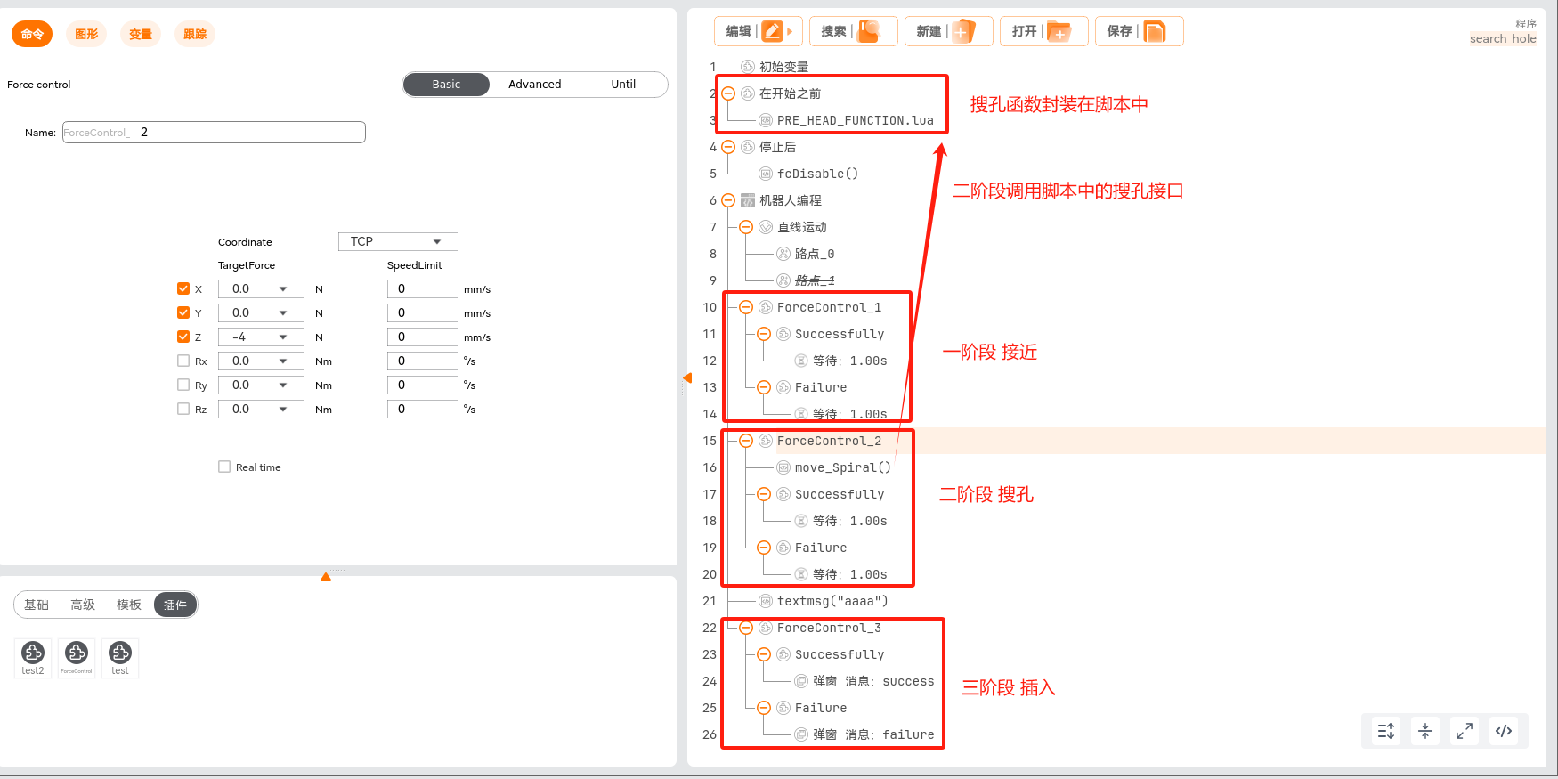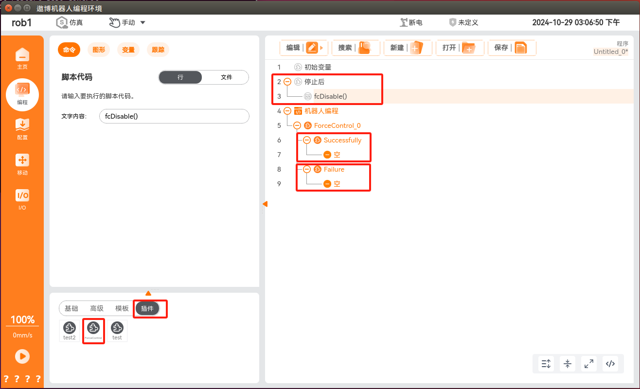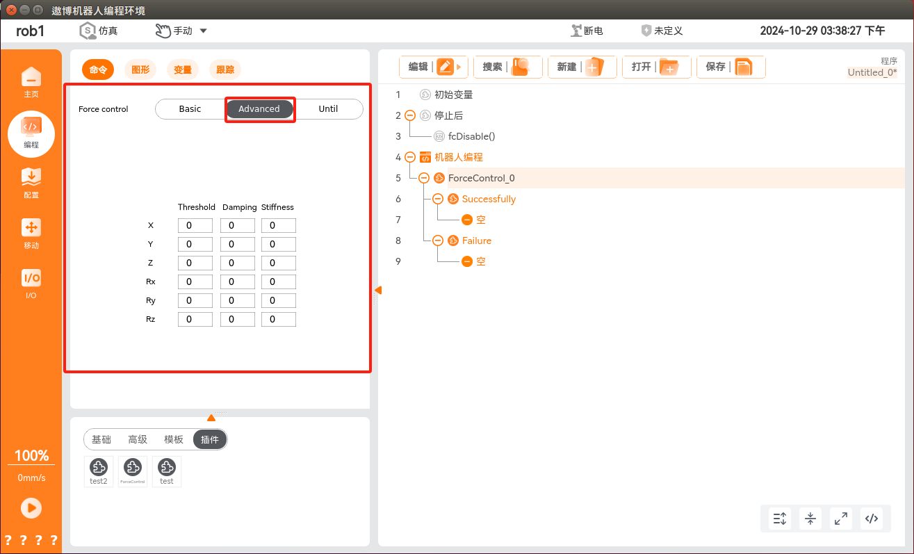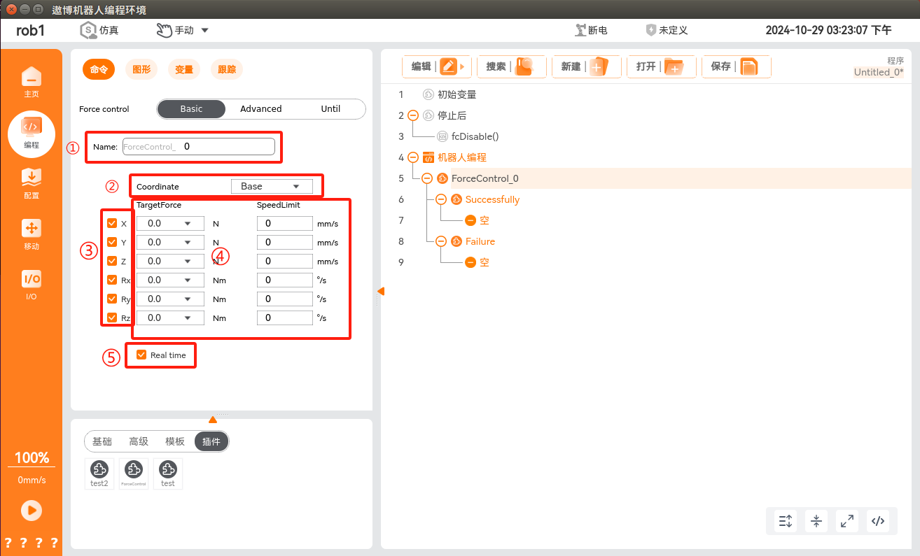 在程序节点中添加力控条件,单击“编程 > 插件 > ForceControl”,即可添加力控条件,此条件分为力控条件配置和正常/异常退出力控条件后的流程实现。