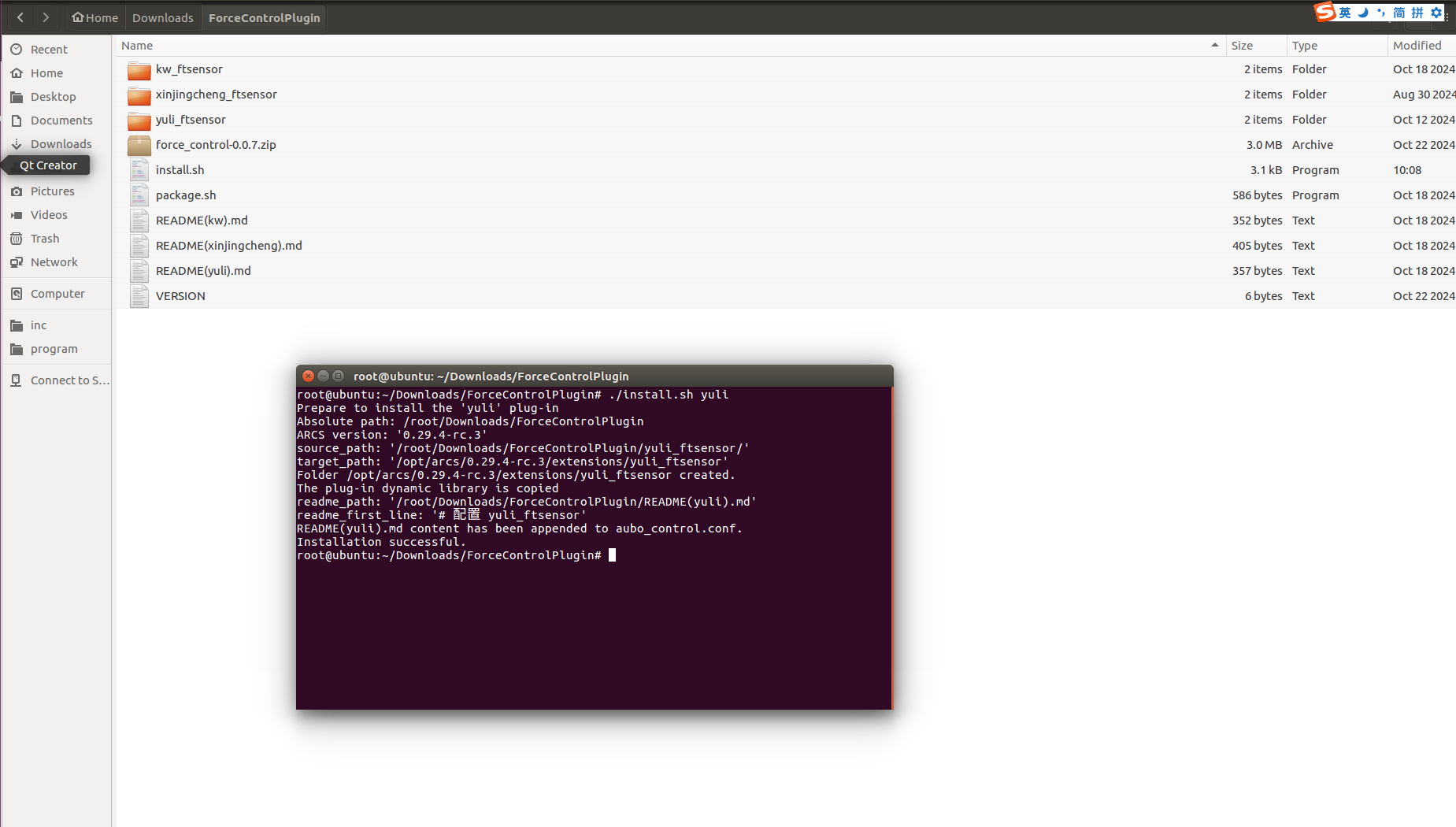 使用力控插件需要 ARCS上位机版本为 0.29.2-beta.15 及以上,同时需要安装力控插件和配置相应参数,以上能通过插件部署压缩包进行一键部署,插件部署压缩包请向 AUBO 询问获取。将部署压缩包置于任意路径解压,使用终端到解压后的文件路径下,输入 sh install.sh 传感器类型命令执行安装脚本,即可完成力控插件和传感器插件的部署和配置文件的参数写入。