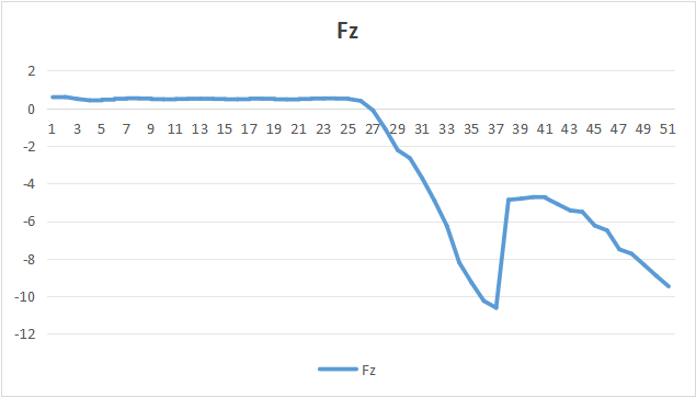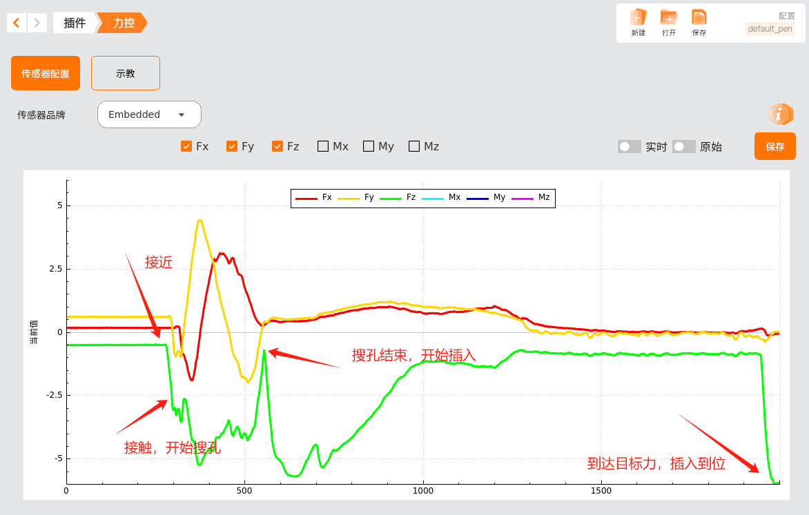 第三段过程是插入,设置 Z 方向目标力为6N,XY 方向目标力为0,使工件能沿着孔洞插入进去。