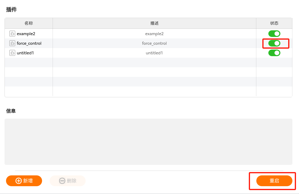 添加插件后,勾选力控插件,单击【重启】,即可完成插件的启用。