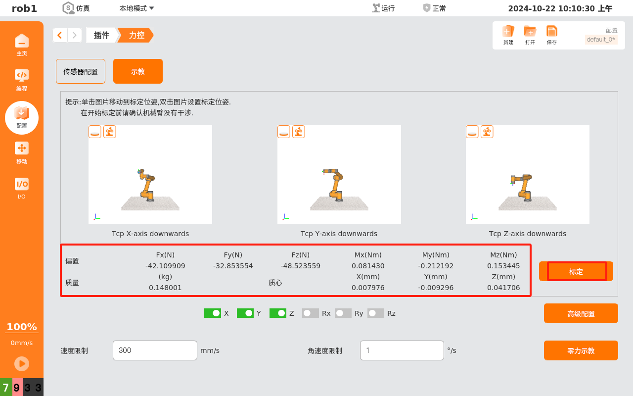 然后进行传感器的标定,单击【标定】即可自动进行标定。注:在标定前务必保证传感器配置界面能正常读取力数据,且需要保证在标定过程中机械臂没有干涉,不会受到碰撞等影响。标定结束后,参数框会显示偏置、质量和质心数据,根据需要重新设置负载参数。