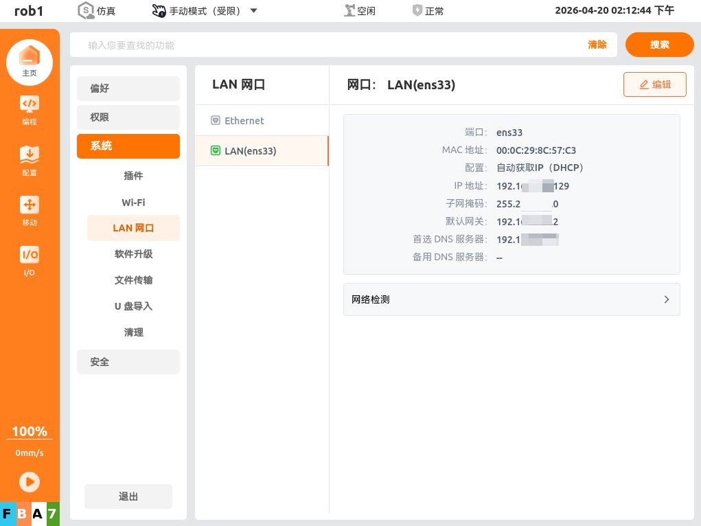 在 Aubo 示教器主页依次单击“设置 > 系统 > LAN 网口 > LAN(ens33)”获取控制柜 IP。