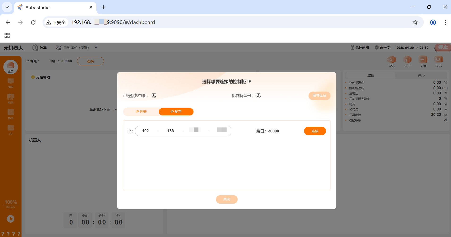 控制柜 IP:9090例如192.168.×××.×××:9090,即可在浏览器进入 AuboStudio。在弹窗中【IP 配置】页输入控制柜 IP 并单击【连接】即可进入 AuboStudio 控制界面。