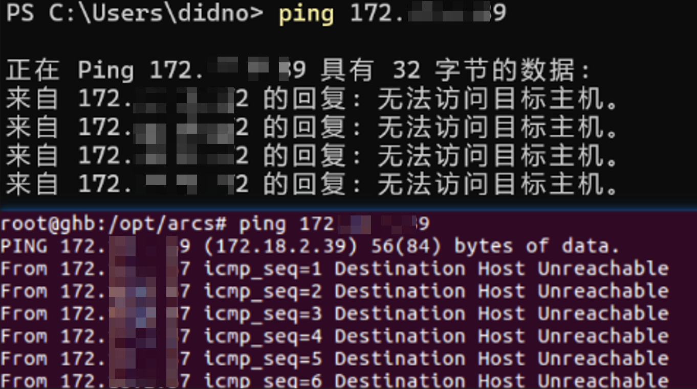 当返回 无法访问目标主机 或 Host Unreachable,即代表通讯异常。