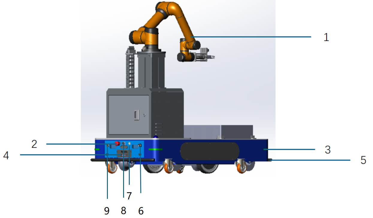 | 6 | 解闸开关 | 顺时针旋转解闸开关后,可手动推动AGV |