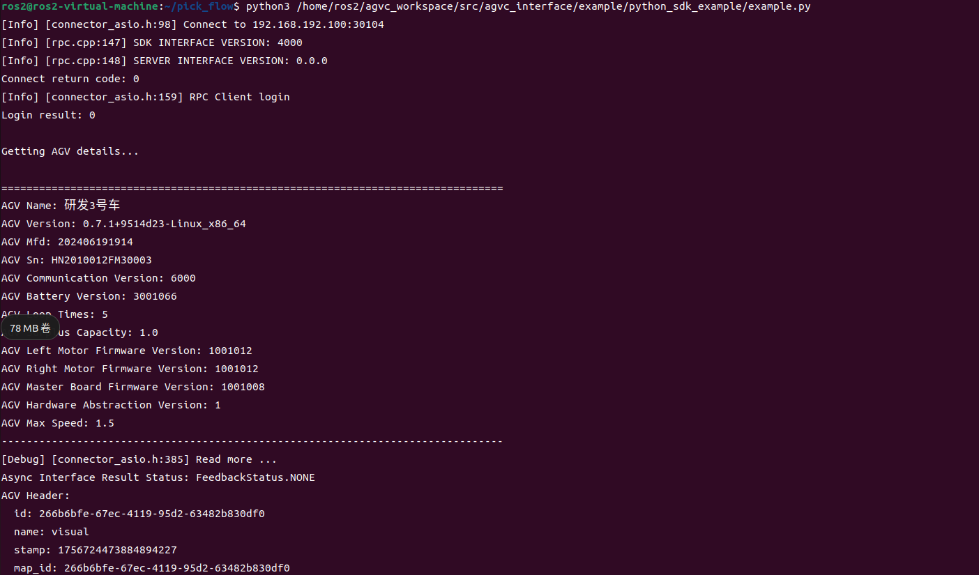 python 脚本路径/example.py - 运行成功后,终端将打印信息,机器人向前行驶: