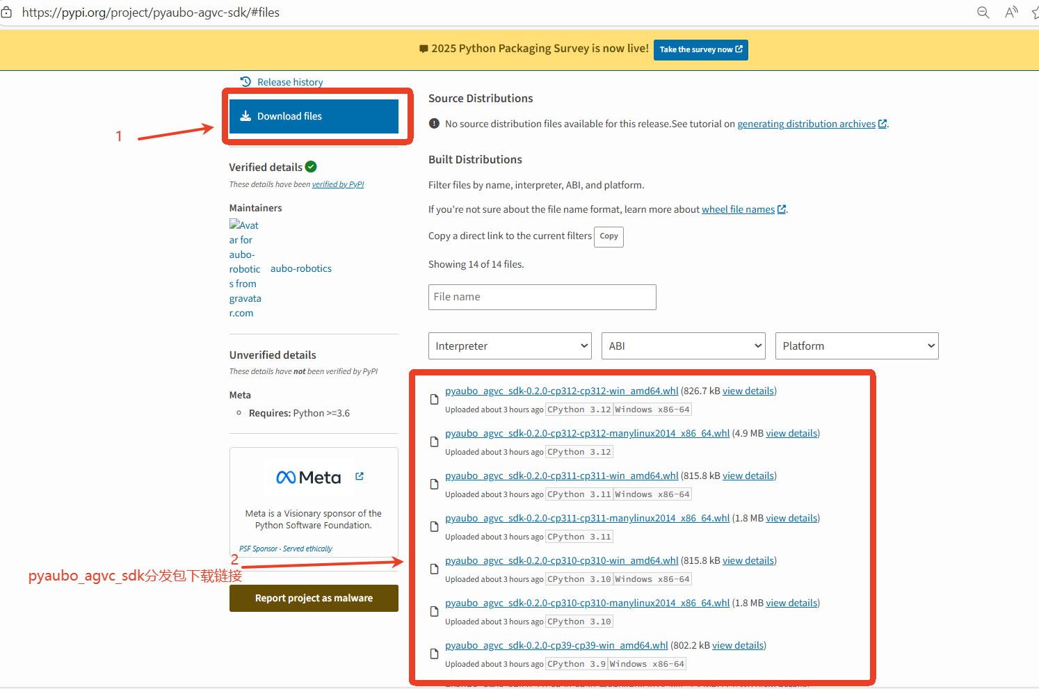 - 进入包详情页,点击“Download files”,在“Built Distributions”栏选择对应版本的