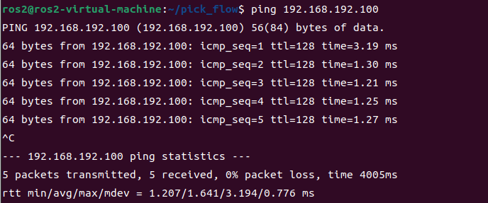 打开终端,输入ping 192.186.192.100,通信成功示例: