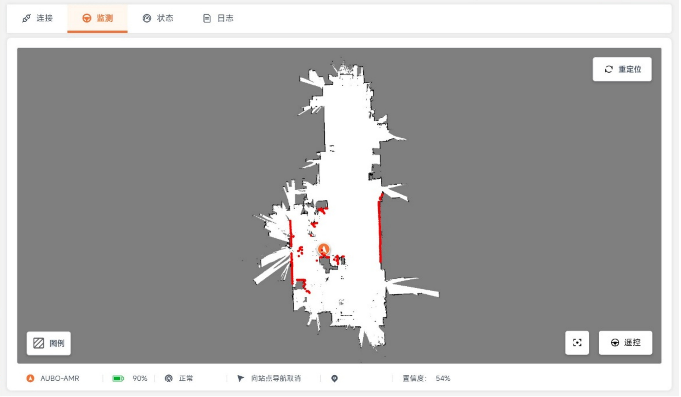- 验证定位:打开“首页”通过查看监控区的定位置信度、观察激光点云是否多数落在墙壁上等方式,检查机器人的定位是否准确,如需重新定位,请参见“7.2.2 AGV 控制功能”。
