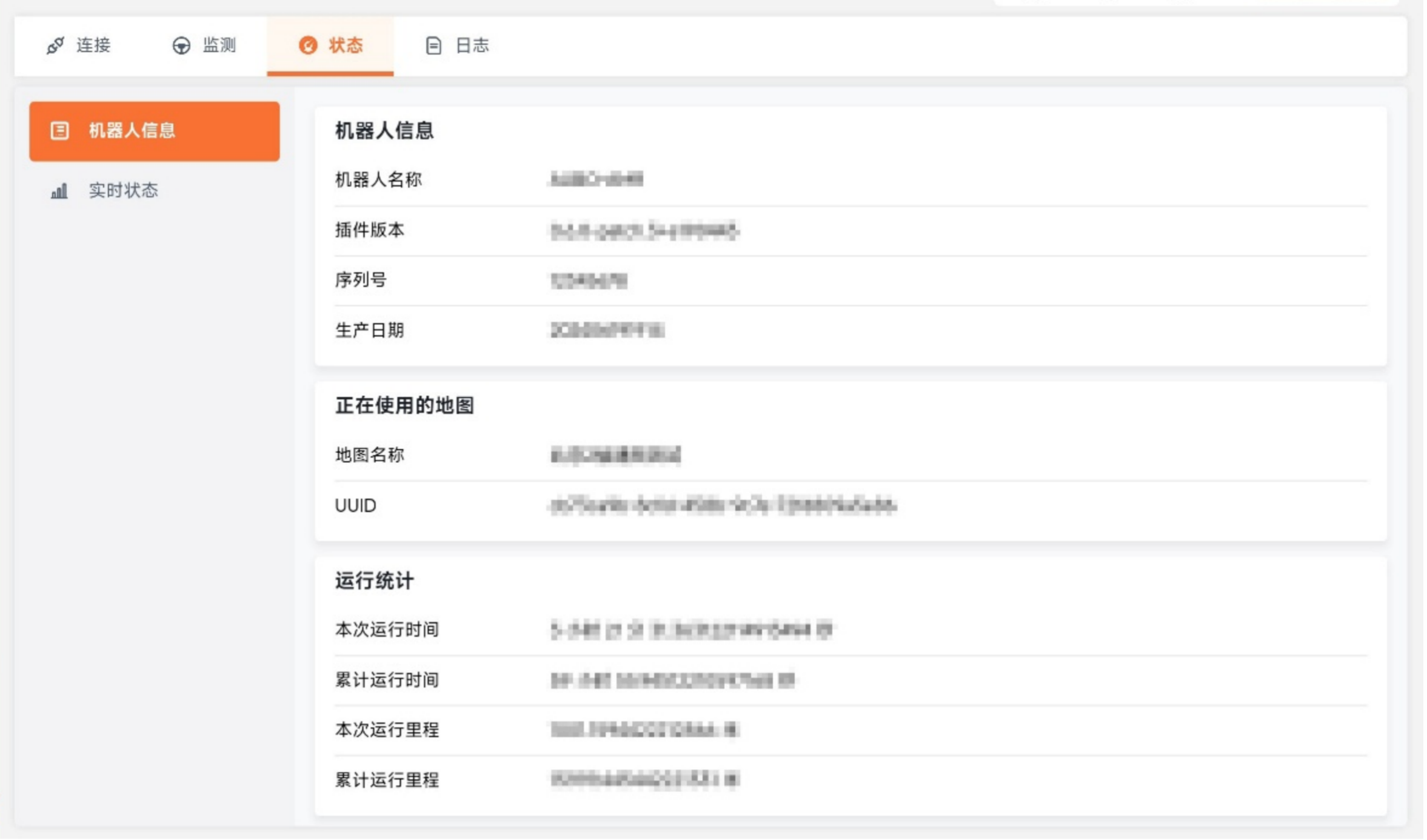 可查看 AGV 的详细信息和实时状态,包括设备信息、AGVC 版本信息、运行统计数据、AGV 的实时状态参数等。