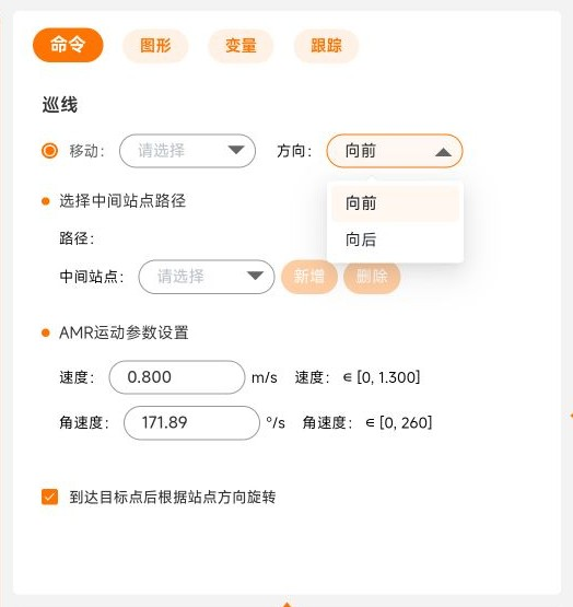 - 到达目标点后根据站点方向旋转:勾选后,AGV 到目标站点时,会自动调整朝向至站点预设方向。