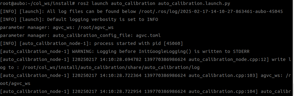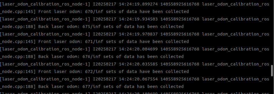 agv_calibration_msgs/srv/CalibrationCommand "command: 2"手动控制 agv,使其进行 8 字形移动,这时会看到第一个启动的终端里面,一直在刷新,当标定数据量大于两千时,数据采集完成。