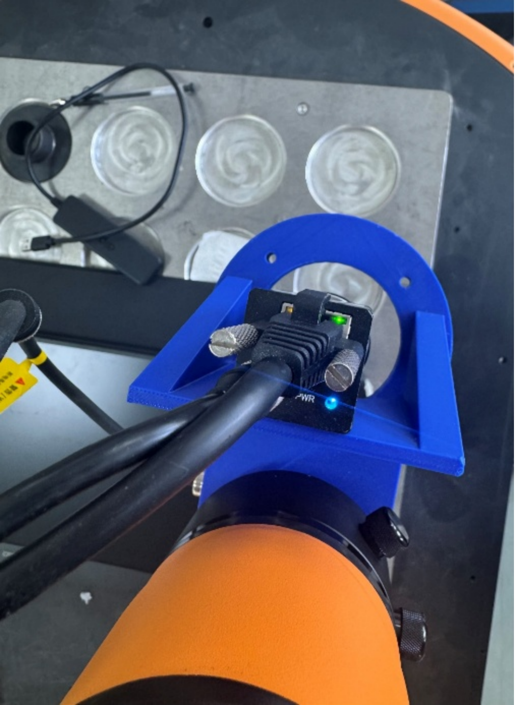 - 使用相机供电线缆与光源延长线,一端连接相机供电口和光源电源线(图 18、图 19),另一端穿过底盘上台面过线孔插入接口板 DC24V 输出接口(图 20),正负极不可接反。