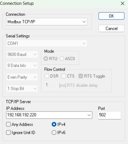 Modbus Slave 进行连接,设置本地 IP 地址,设置端口号为 502。