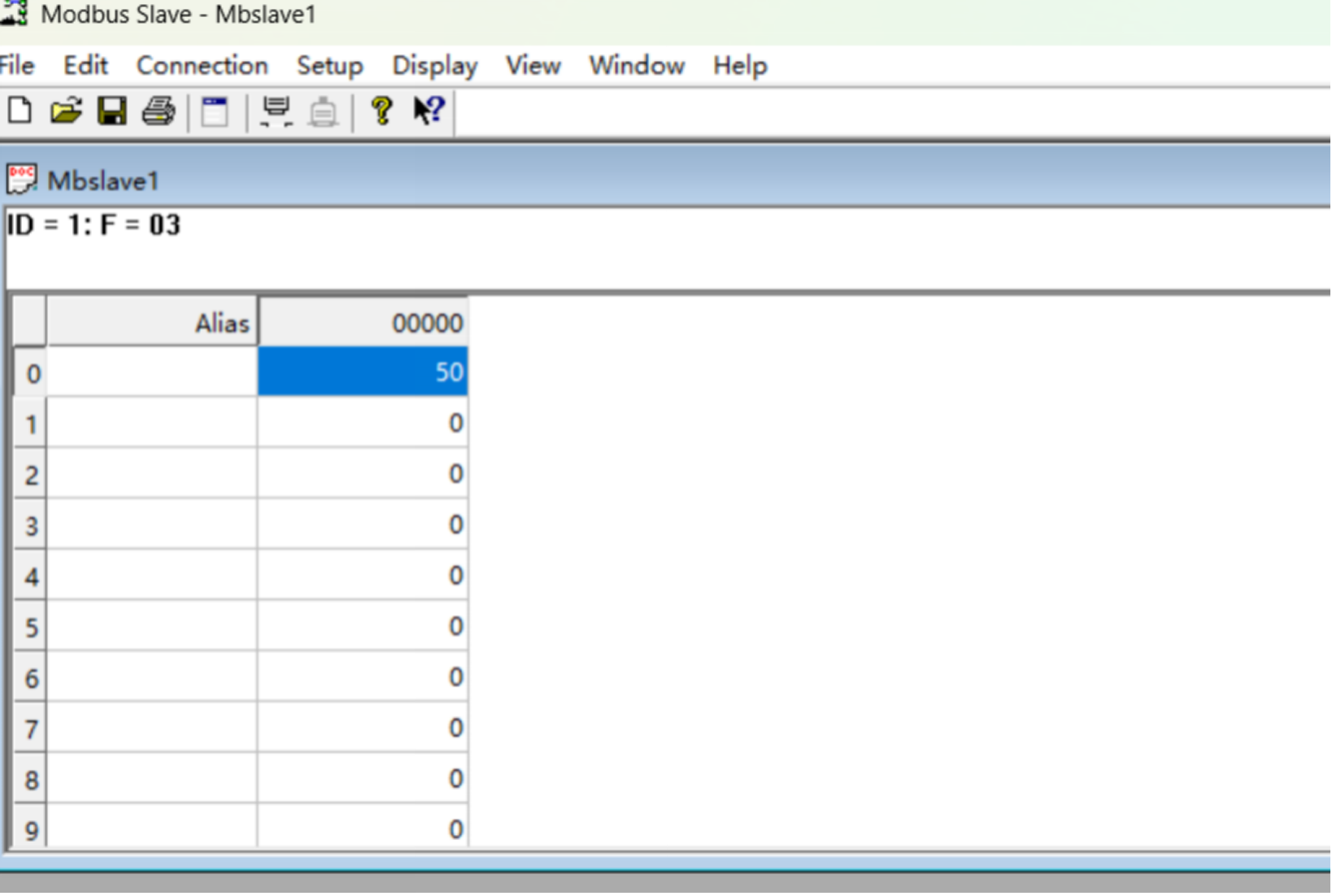 设置地址值,如在地址 0 设置值为 100,寄存器类型为 03 保持寄存器。