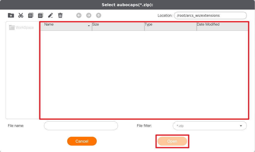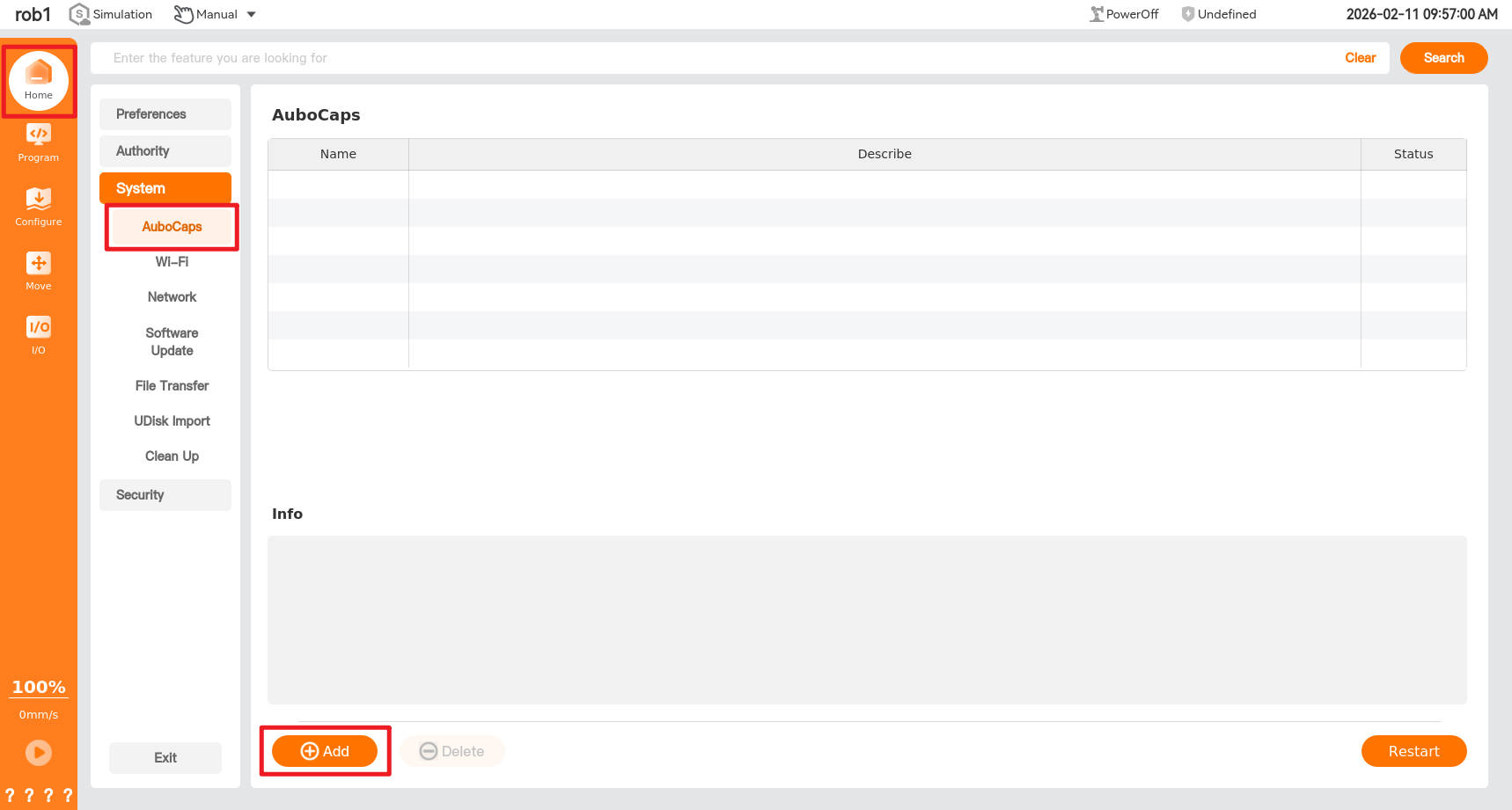 Click [AuboCaps] to enter the plugin interface, click [Add] in the lower left corner of the interface, select the welding process package file, and click [Open] to import the welding process package.