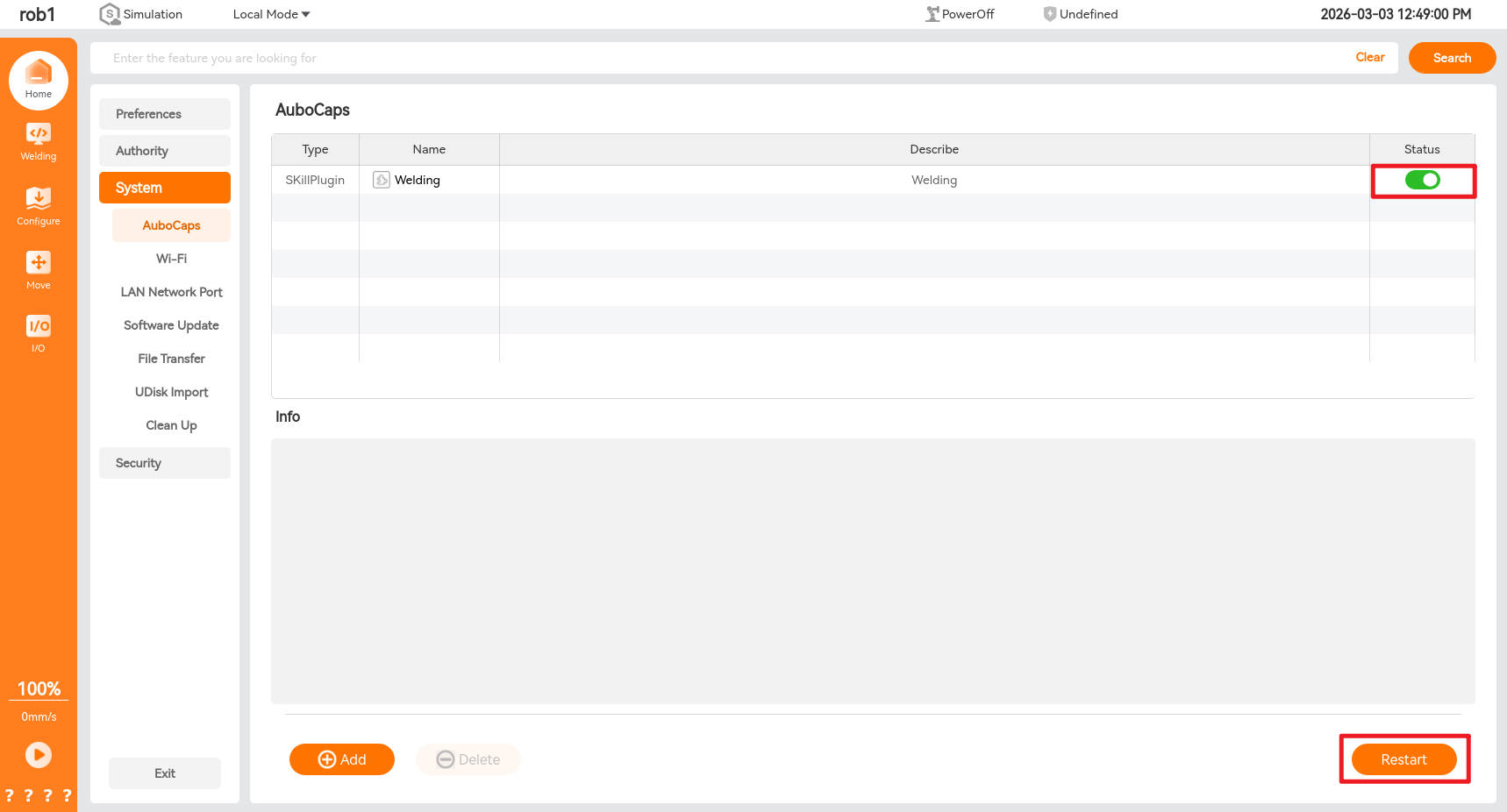 Set the status button of the process plugin "Welding" to green, and click [Restart] to restart the control box.