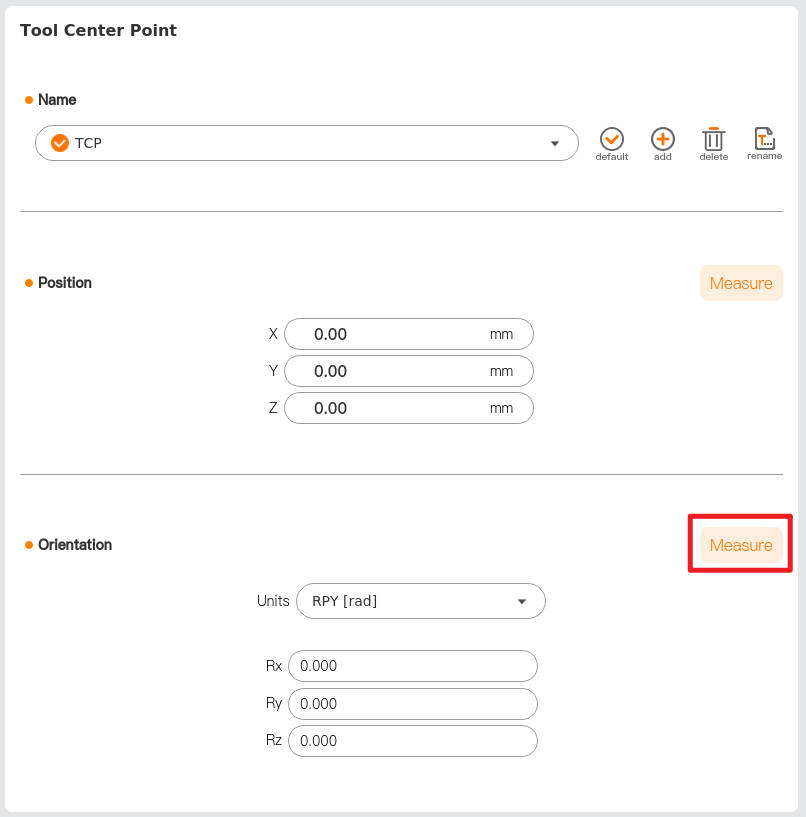 Click [Add] to create TCP_0, click [Rename] to rename the tool coordinate system, and click "Position > Measure" to enter the [Teach TCP Position] wizard.