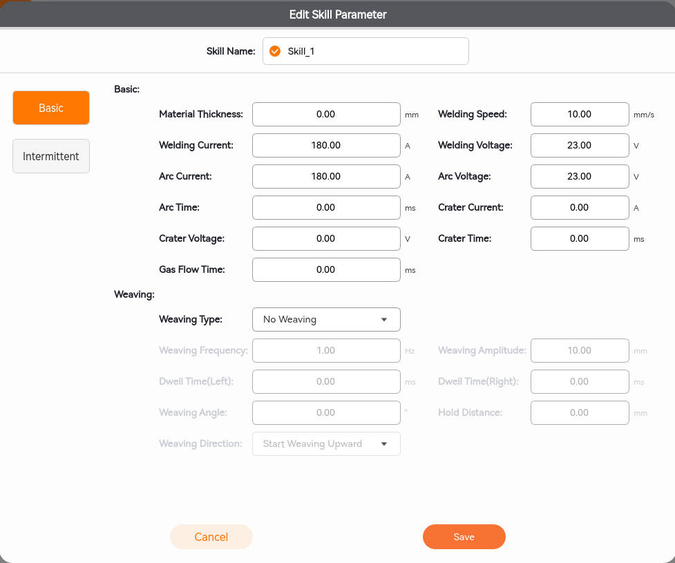 Click the [Welding Skill] dropdown box, select [Custom Skill], then click [View Parameters] for the parameter configuration. After making modifications, click [Save].