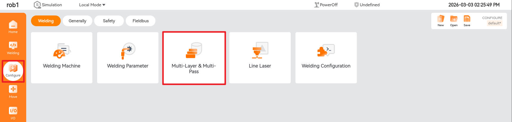Click "Configure > Welding" to enter the welding configuration interface. The welding configuration currently includes five parts: "Welding Machine" configuration, "Welding Parameters" configuration, "Multi-layer and Multi-pass Welding" configuration, "Line Laser" configuration, and "Welding Configuration" configuration.