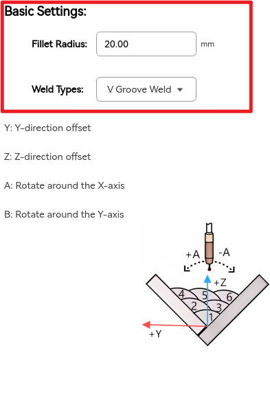 - Swing parameters: These are the relevant parameters of the robot's swing process when the robot performs a welding swing (zigzag swing, crescent swing, etc.).