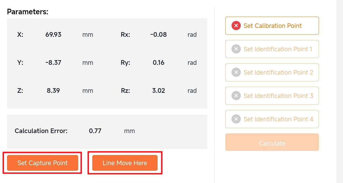 After completing hand-eye calibration, direct the laser onto the weld type corresponding to the job number while observing the sensor's recognition results. Upon successful recognition, sequentially click [Set Capture Point] -> [Line Move Here]. Long-press to automatically move the robot arm to the recognition point, verifying whether the hand-eye calibration accuracy meets operational requirements.
