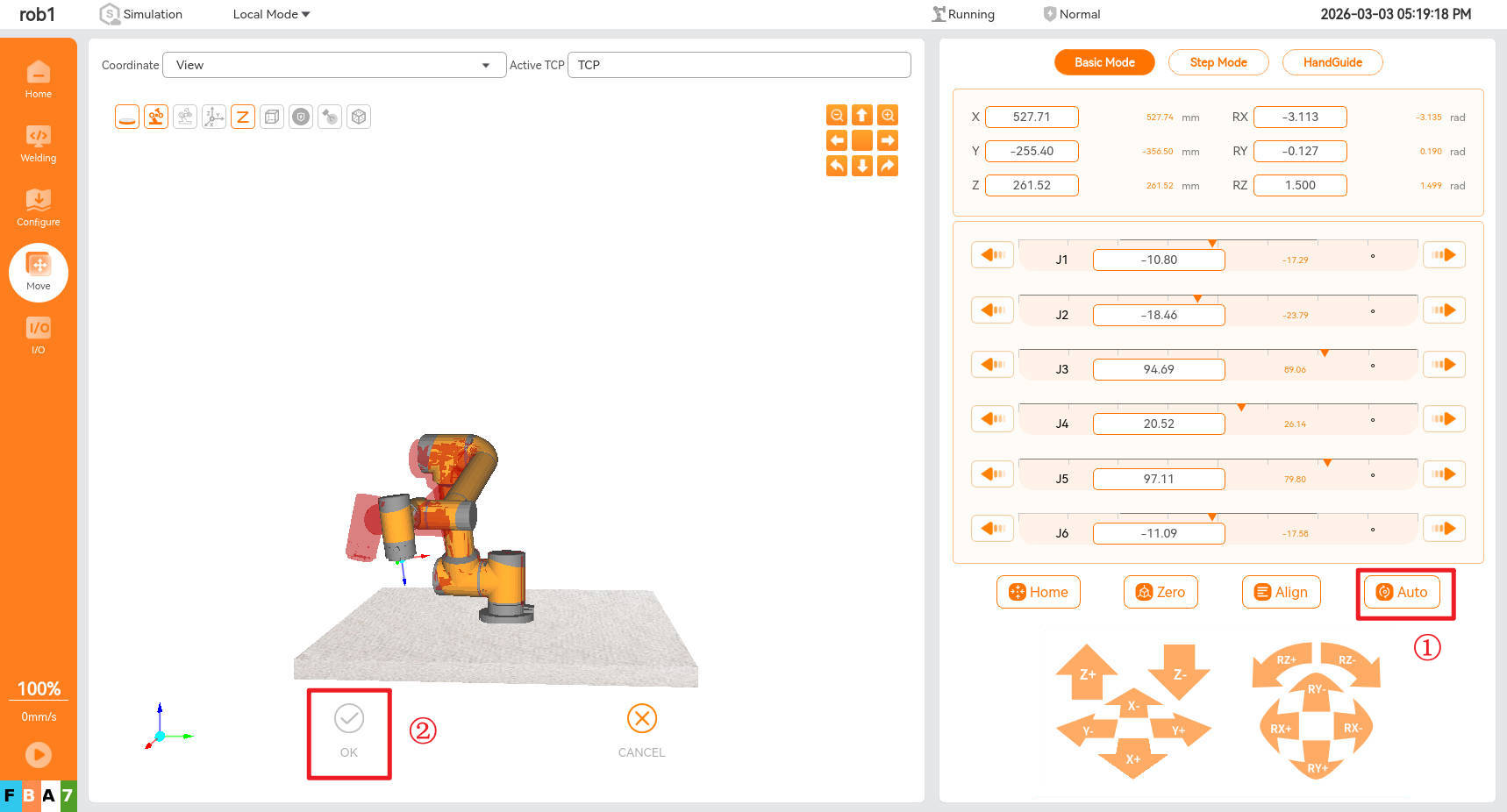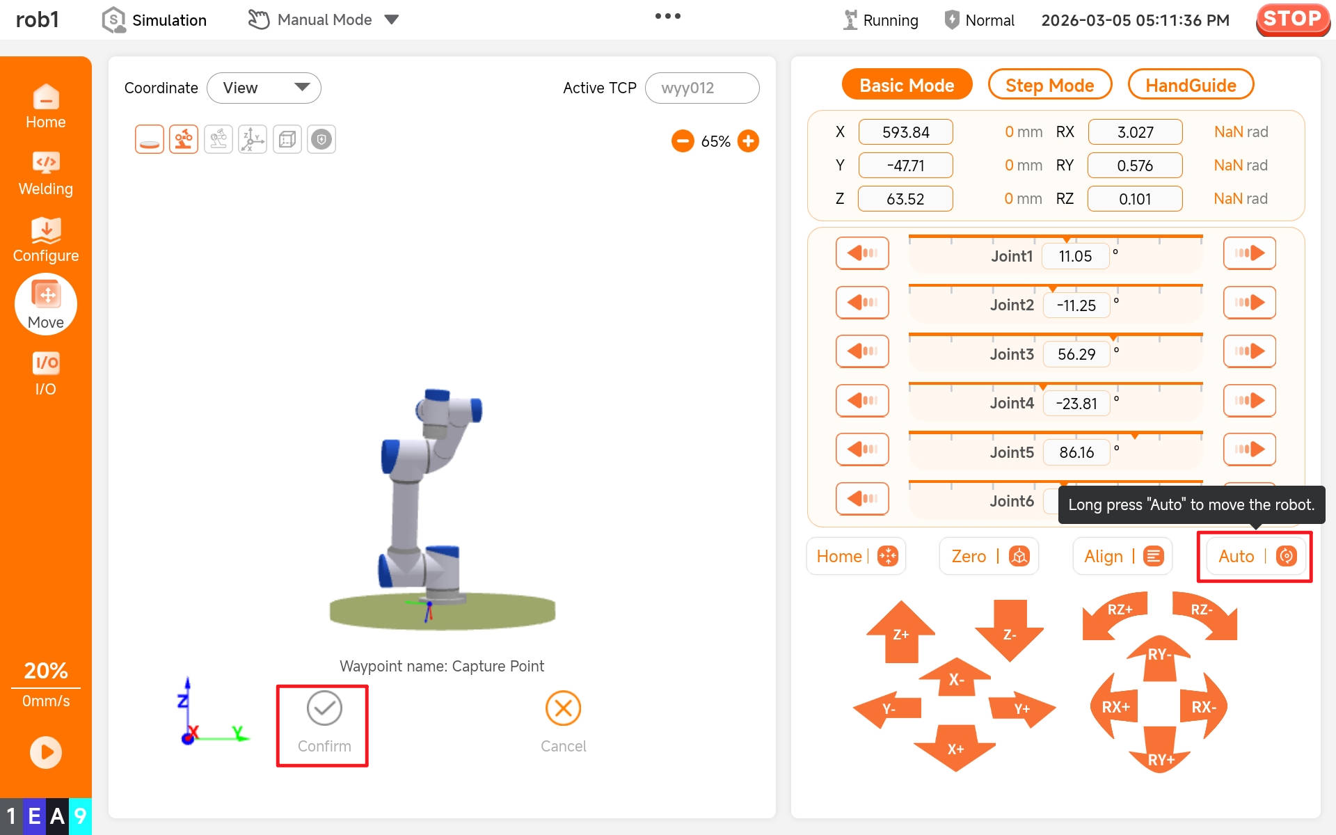 Long press the [Auto] button to have the robot arm move to the set attitude using the selected "Line" or "Joint" motion mode. After stopping the motion, click [OK] to complete moving to the commanded joint attitude.