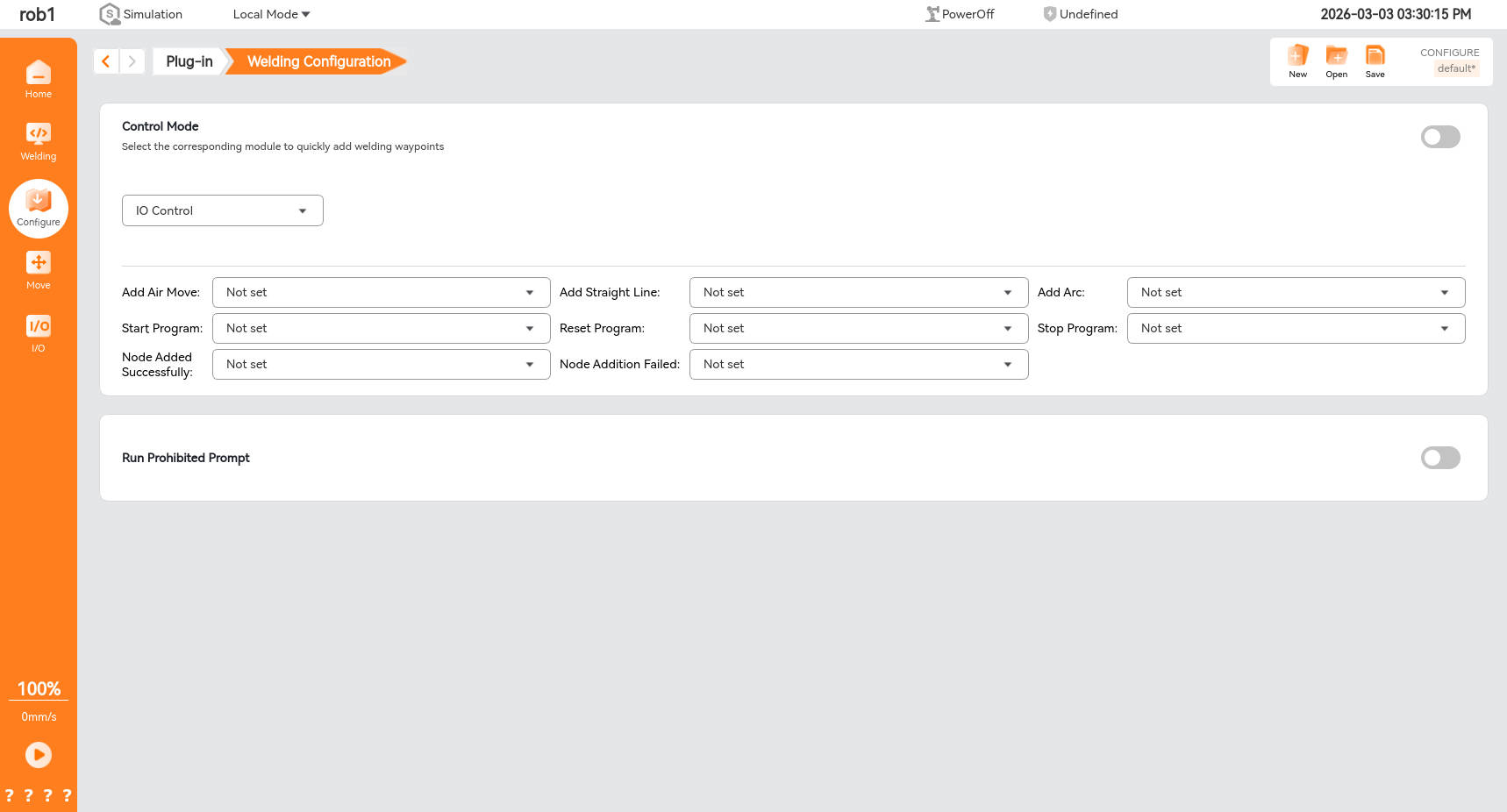Click [Configuration] -> [Welding Configuration] to enter the welding configuration interface. This interface includes two modules: “Control Mode” and “Run Prevention Prompt.”
