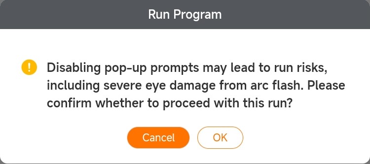 To prevent the teach pendant from displaying the program run prompt window when the operator clicks the [Run Program] button and instead execute the program directly, enable the Run Prompt Disable switch. When the button corresponding to the [Run Program] I/O port is clicked, the teach pendant will not display the program run prompt window, and the program will begin execution immediately.