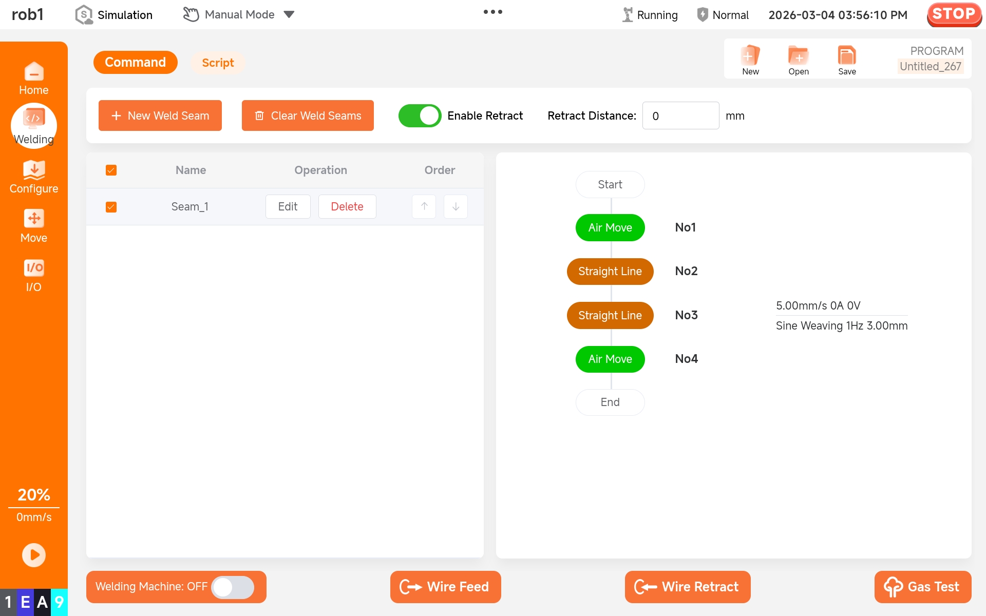 *Welding Machine: Turn the welding machine switch to "ON" to establish communication between the welding machine and the robot arm. Once the welding route is determined, click the start program button to begin welding. *Wire Feed: Turn the welding machine switch to "ON," click [Wire Feed] button, and the welding wire will be fed through the welding torch. *Wire Retract: Turn the welding machine switch to "ON," click [Wire Retract] button, and the welding wire will be retracted through the welding torch. *Gas Test: Turn the welding machine switch to "ON," click [Gas Detection] button, and the gas will be sent out from the welding torch.
