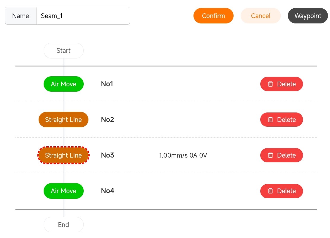 After clicking [Welding] -> [New Weld Seam], you can begin adding path points. Click the corresponding buttons for [Add Empty Point], [Add Straight Point], [Add Straight Point], and [Add Empty Point] in sequence to generate the following path. Note that path points can only be successfully added when the teach pendant interface is in the [Welding] screen.