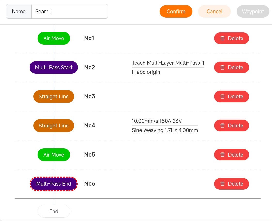 - End multi-layer and multi-pass welding: Execute the end command for multi-layer and multi-pass welding. Obstacle avoidance points must be added before the end point of multi-layer and multi-pass welding.